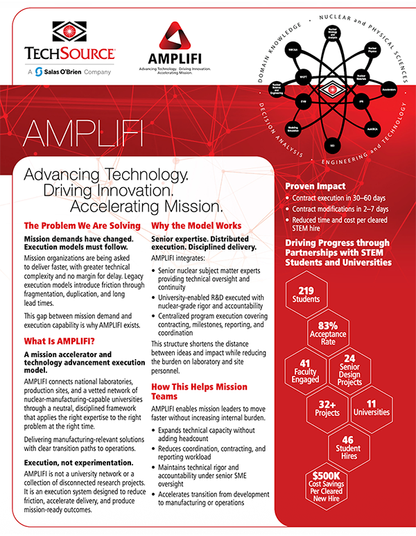 Learn MoreAMPLIFI is a purpose-built innovation and manufacturing program for Nuclear Security Enterprise laboratories and production sites. It accelerates technical progress, expands innovation capacity, and strengthens national security by connecting senior nuclear expertise, a national university ecosystem, and a neutral collaboration environment.